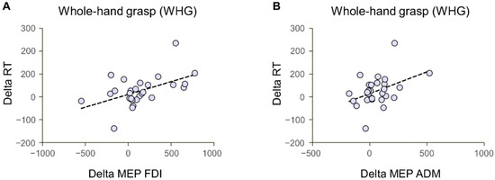 Correlations between MEP and RT delta values (Interactive—Non-Interactive condition). Both the differential index for the FDI (A) and ADM (B) MEP values positively correlated with the Reaction Times (RT) in the preparation of whole-hand grasps.