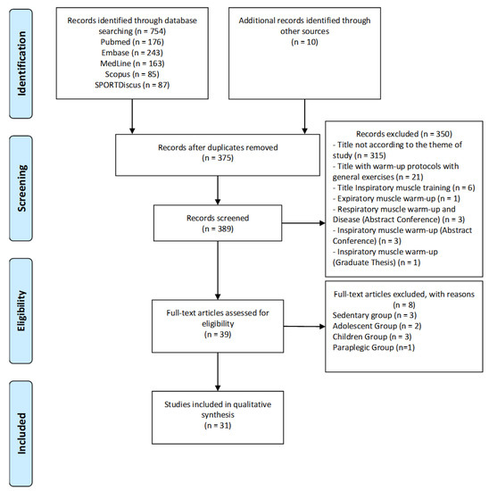 Initially, a total of 764 studies were selected, of which 176 were from PubMed, 243 were from Embase, 163 were from MedLine, 85 were from Scopus, 87 were from SPORTDiscus and 10 were from Google Scholar (additional database). Next, 375 duplicates were excluded, resulting in 389 studies. Of these, we excluded three-hundred and fifty titles for not being in accordance with the study topic, twenty-one titles with warm-up protocols applied to general exercises, six titles with inspiratory-muscle training, one title with expiratory-muscle warm-up, three titles with respiratory-muscle warm-up associated with disease (conference abstract), three titles with IMW (conference abstract) and one study published as a graduation thesis. From the remaining thirty-nine studies, we extracted three that were applied to sedentary groups, two that were applied to groups of adolescents (aged below 18 years), three that were applied to a group of children and one that was applied to a group of paraplegics. Finally, a total of 31 studies were included in this systematic review (Figure 1).