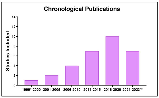 Among the selected studies, the chronological analysis of the publications (Figure 2) showed an exponential increase in investigations related to IMW from 1999 (the first study on the subject) to 2020. It should be noted that between 2021 and 2022, 7 studies were published prior to this review (17 January 2023).