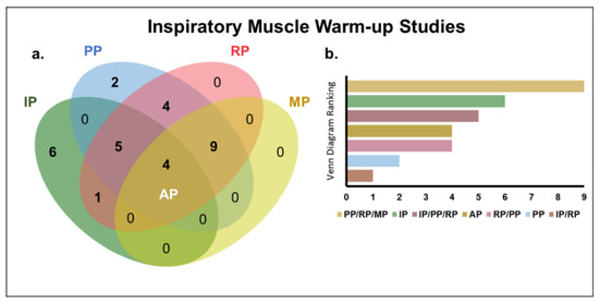 Inspiratory-muscle-warm-up studies. (a) Venn diagram [57] of the intersection of studies on the effects of inspiratory-muscle warm-up in relation to the investigated parameters. (b) Ranking of the intersections of the Venn diagram (number of studies evaluating the investigated parameters). All parameters (AP); inspiratory parameters (IP); performance parameters (PP); respiratory parameters (RP); and metabolic parameters (MP).