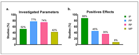 Percentage of studies on the effects of inspiratory-muscle warm-up on inspiratory parameters (IP); performance parameters (PP); respiratory parameters (RP); and metabolic parameters (MP). (a) Investigated parameters. (b) Positive effects.