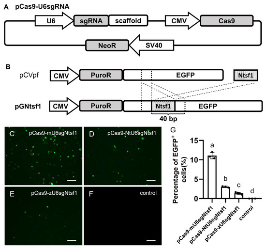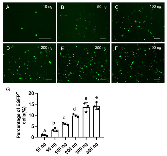 Figure 2. The dosage optimization of pCas9-mU6sgNtsf1 on its gene editing efficacy. (AF) SG3 cells in 24-well plates were transfected with pCas9-mU6sgNtsf1 at different doses (10 ng, 50 ng, 100 ng, 200 ng, 300 ng and 400 ng) and pGNtsf1 (200 ng), the cells were monitored under fluorescent microscopy to evaluate the gene editing efficacy 48 h after transfection. Scale bars, 100 μm. (G) Quantification of the percentage of EGFP+ in different groups. Data are shown as means ± standard derivation. Different letters above the bars represent significant differences between the groups (p < 0.05).