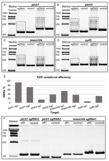 Multiple heteroduplex or homoduplex DNA bands were observed in all of the eight pCas9-mU6sgRNAs, whereas no heteroduplex or homoduplex DNA bands were observed in the control of each group (Figure 3A–D). To quantitate INDEL mutation frequency, the PCR products of each sample were subjected to TIDE analyses. The indel rates of the targets ranged from 31.2% to 93.7%, except for the relatively low indel rates from pCas9-mU6sgRNA targeting ptch2 sgRNA1 (14.8%) and sytl5 sgRNA1 (6.5%), respectively (Figure 3E). To further confirm the indels mediated by pCas9-mU6sgRNA, the PCR products were recovered and subcloned for DNA sequencing. Five clones of each sgRNA were sequenced and at least one type of indel by each pCas9-mU6sgRNA was obtained (Figure S3).