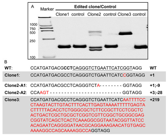 44. Brinkman, E.K.; Chen, T.; Amendola, M.; van Steensel, B. Easy quantitative assessment of genome editing by sequence trace decomposition. Nucleic Acids Res. 2014, 42, e168. [Google Scholar] [CrossRef]