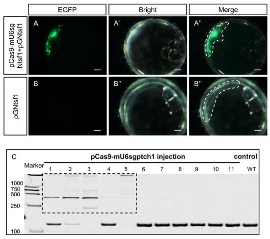 Figure 5. pCas9-mU6sgRNA mediated the exogenous and endogenous gene editing in medaka in vivo by one-cell embryo microinjection. (AB″) Microscopy images of medaka embryos injected with pCas9-mU6sgNtsf1 and the reporter vector pGNtsf1 (AA″) or injected with pGNtsf1 alone (BB″) 24 h after injection. Scale bars, 100 μm. (C) HMA of DNA templates extracted from embryos injected with pCas9-mU6sgptch1. Genomic DNA of each embryo was extracted separately. Boxed area indicates the heteroduplex or homoduplex DNA bands in amplicons from pCas9-mU6sgptch1 injected medaka embryos.