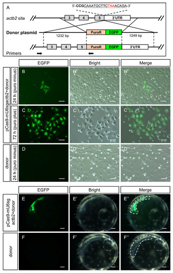 Figure 6. pCas9-mU6sgRNA efficiently mediated the reporter gene puroR-EGFP knock-in in medaka cultured cells and embryos. (A) Schematic diagram of gene targeting strategy at medaka actb2. The donor plasmid containing a promoter-less puroR-EGFP gene was constructed for targeting actb2. Stop codon is shown in red font. The sgRNA target site is indicated by underline and PAM sequence is indicated in bold. PuroR stands for puromycin resistance gene. A pair of primers used for genotyping are indicated by arrows. The length of the left and right homologous arm are 1232-bp and 1249-bp, respectively. (BC″) Representative microscopy images of EGFP+ SG3 cells before (BB″) and after (CC″) 1 mg/mL puromycin selection. (DD″) Representative microscopy images of the control cells transfected only with the donor plasmids. Scale bars, 50 μm. (EF″) Microscopy images of medaka embryos injected with pCas9-mU6sgactb2 and the donor plasmid (EE″) or injected with the donor plasmid alone (FF″) 24 h after injection. Scale bars, 100 μm.