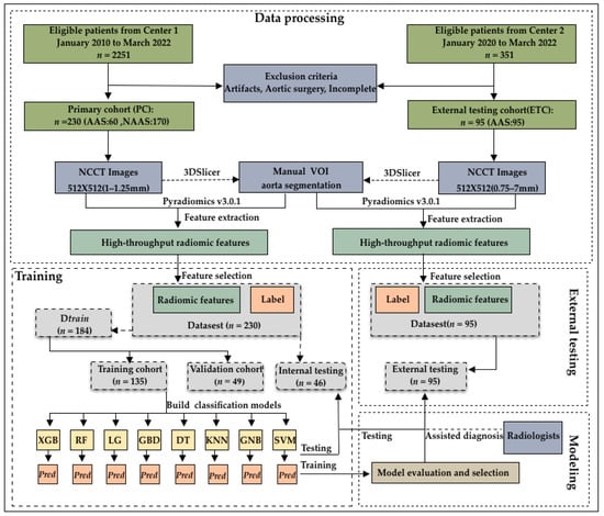 - Guo, Y.; Chen, X.; Lin, X.; Chen, L.; Shu, J.; Pang, P.; Cheng, J.; Xu, M.; Sun, Z. Non-contrast CT-based radiomic signature for screening thoracic aortic dissections: A multicenter study. Eur. Radiol. 2021, 31, 7067–7076. [Google Scholar] [CrossRef] [PubMed]
