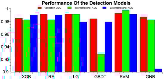 AAS detection performance results of the models in the training, validation, and external test cohorts. ACC, accuracy; AUC, area under the curve; XGB, eXtreme Gradient Boostin; RF, Random Forest; LG, logistic regression; GBDT, Gradient Boosting Decision Tree; SVM, Support Vector Machine; GNB, GaussianNB.