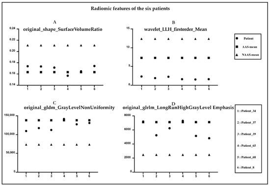 Radiomic features of the six patients diagnosed with AAS. (A) original_shape_Surface_Volume Ratio. (B) Wavelet_LLH_firstorder_Mean. (C) original_gldm_GrayLevelNonUniformity. (D) original_glrlm_LongRunHighGrayLevelEmphasis.