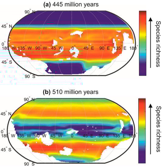 - Mannion, P.D.; Upchurch, P.; Benson, R.B.J.; Goswami, A. The latitudinal biodiversity gradient through deep time. Trends Ecol. Evol. 2014, 29, 42–50. [Google Scholar] [CrossRef] [PubMed]