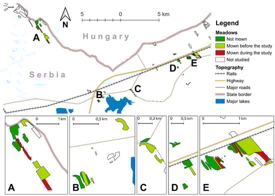 Occurrence of P. teleius in the Republic of Serbia is limited to about 210 ha of wet meadows in the very north of the country. More details on this habitat and butterfly population are published elsewhere [49]. A complete study system includes three geographic areas (Subotica Sandland, Ludaš Lake and Selevenj Heath), which are delineated in five sampling localities in our studies, primarily for logistic reasons (Figure 1: letters A–E). These geographic areas are:
