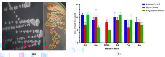 (a) The colony morphology of the strain AC-40 on starch casein agar; (b) zone of inhibition in (mm) produced by the cell-free supernatant and ethyl acetate extract of the strain AC-40 against B.C (Bacillus cereus), S.A (Staphylococcus aureus), MRSA (methicillin-resistant Staphylococcus aureus), E.C (Escherichia coli), P.A (Pseudomonas aeruginosa), and CA (Candida albicans). An amount of 10% DMSO was used as a negative control, and gentamycin (10 μg/mL) was used as a positive control.