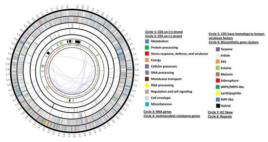 After the genomic DNA extraction, sequencing, and the de novo assembly of the genome of the strain AC-40, a total of 1048 contigs covering 7,493,232 bp were obtained. The average GC% was 72.41. Using the similar genome finder tool, the genome of Streptomyces sp. Osf17 (7,967,258 bp) was found to be the closest genome to the genome of strain AC-40 with a distance of 0.00944662. The genome of Streptomyces sp. Osf17 (GCA_019029505.1) is a two contigs genome (7,883,883 bp and 83,375 bp) sequenced with the PacBio Sequel technology. By using the genome of Streptomyces sp. Osf17 as a reference for the reference-guided scaffolding, one scaffold representing the bacterial chromosome was obtained. Genome annotation was conducted using two different platforms. The number of annotated CDSs was higher in the case of the RAST platform than it was in Prokka. A total of 7241 CDS (5059 functional), 35 transfer RNA (tRNA) genes, and 3 ribosomal RNA (rRNA) genes were annotated with RAST. A total of 6983 CDS (3303 functional), 82 tRNA genes, and 3 rRNA genes were annotated with Prokka. The genome map is illustrated in Figure 2.
