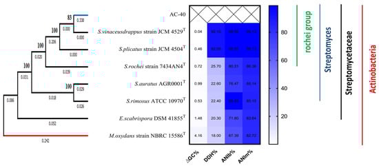 The TYGS indicated a close relationship between the genome of AC-40 and Streptomyces species. The top hit was Streptomyces vinaceusdrappus (Streptomyces rochei group).