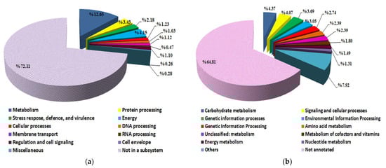 (a) a subsystem analysis by PATRIC platform indicates the number of genes incorporated in specific biological process within the genome of S. vinaceusdrappus strain AC-40; (b) a functional categorization of KEGG annotations of the genome of S. vinaceusdrappus strain AC-40 using the GhostKOALA tool.
