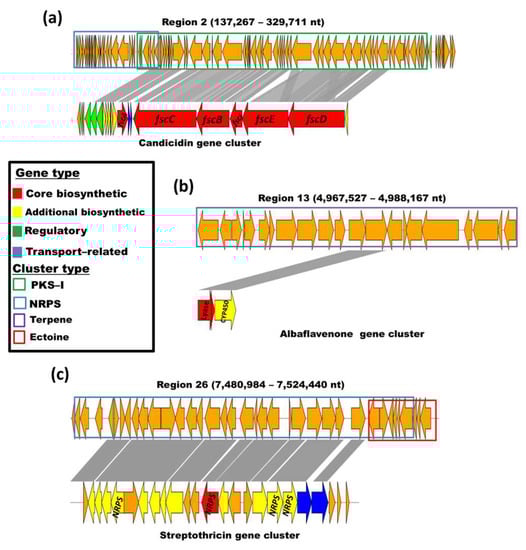 Similarity to known antimicrobial metabolites BGCs in three of the regions detected with AntiSMASH in the genome of Streptomyces vinaceusdrappus strain AC-40: (a) candicidin; (b) albaflavenone; (c) streptothricin. The characteristics of the clusters and gene types are indicated in the box.