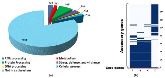(a) Subsystem analysis of the rochei group’s core genome indicates the number of genes incorporated in specific biological process; (b) gene presence–absence matrix in the four genomes A (S. vinaceusdrappus strain AC-40), B (S. vinaceusdrappus strain JCM 4529), C (S. plicatus strain JCM 4504), and D (S. rochei strain 7434AN4).