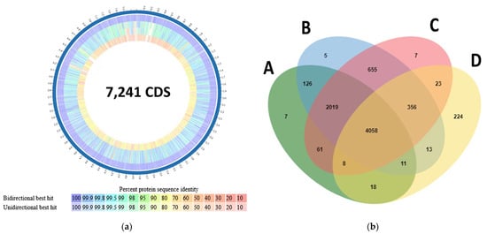 (a) Proteome similarity analysis carried out by the proteome comparison tool on PATRIC between—as ordered from the outside to the inside—S. vinaceusdrappus strain AC-40 as a reference, S. vinaceusdrappus strain JCM 4529, S. plicatus strain JCM 4504, and S. rochei strain 7434AN4; (b) A Venn diagram indicated the shared orthologous protein clusters among A (S. vinaceusdrappus strain AC-40), B (S. vinaceusdrappus strain JCM 4529), C (S. plicatus strain JCM 4504), and D (S. rochei strain 7434AN4).