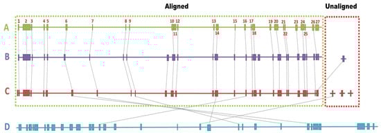 A relation between 27 biosynthetic gene clusters among A (S. vinaceusdrappus strain AC-40) as a reference, B (S. vinaceusdrappus strain JCM 4529), C (S. plicatus strain JCM 4504), and D (S. rochei strain 7434AN4). The labels aligned and unaligned indicate the contigs from genomes B and C that were successfully and unsuccessfully aligned on the genome A as reference for reference-guided scaffolding.