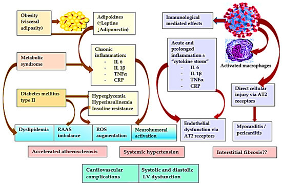 Currently, it has been proven that theSARS-CoV-2 virus exerts its actions both directly, by binding on the cell surface receptors, but also through immunological mediated effects, by activating the innate and adaptive immunity. Therefore, the virus determines the release of large amounts of proinflammatory cytokines, namely interleukine-6 (IL-6) and interleukine-1β (IL-1β), but also of other acute phase mediators, such as ferritin and C-reactive protein, Figure 1. In some individuals, these immune responses can become exaggerated, resulting in an augmented release of cytokines—namely, the “cytokine storm” [7]. Another potential pathway is mediated via the macrophages, responsible for the initiation of the hypoxia-inducible factor (HIF-1α) [7,8]. Although the lungs represent the first target, it has often been suggested that cardiovascular implications are frequent in COVID-19, both in its acute stages as well as during recovery [9,10]. Initial myocardial damages, such as myocarditis, heart failure, or even necrosis, can be explained by the direct action of the virus on the myocytes and vessels, and the subsequent inflammation, endothelial dysfunction, and ischemia [11]. These pathophysiological processes may persist even during the recovery phase, explaining—at least partially—the development of an interstitial fibrosis, resulting in myocardial stiffening with left ventricular (LV) changes, and determining alterations in cardiac contraction and relaxation—frequently associated with the occurrence of heart failure, with a reduced (HFrEF), or preserved ejection fraction (HFpEF) [11,12], Figure 1. A preexisting enhanced pro-inflammatory risk profile, characterized by metabolic imbalance and augmented inflammatory processes—associated with high levels of IL-6 and IL-1β cytokines, alongside adipose tissue-derived TNFα and leptin in subjects with obesity, MS, and T2DM—contributes to an exacerbated immunologic response of “hyper-inflammation” during COVID-19, with deleterious effects [5,6,13], Figure 1. It has been proven that insulin resistance (IR), favored by elevated cytokine levels, represents the hallmark of T2DM, often long preceding its occurrence, but also characterizing MS and obesity [14,15,16]. In obesity, there is an augmented activity of the IL-6 receptor, which, despite elevated levels of circulating cytokines, results in an exacerbated inflammatory state—namely, the so-called meta-inflammation. Moreover, in this metabolic pathology, IR favors the infiltration of the adipose tissue with macrophages, particularly of the highly inflammatory type M1 subpopulation [17,18]. Therefore, lipotoxicity- and glucotoxicity-modulated IR tends to amplify the cardiovascular risk in patients with metabolic dysfunctions, thus favoring the development of systemic hypertension, and left ventricular hypertrophy, frequently associated with DD [19,20]. It, therefore, becomes easy to assume that, in the situation of an already exacerbated inflammatory background, an additional inflammatory burden, such as COVID-19, would trigger multiple systemic injuries, with a worse evolution [21,22,23]. Additionally, as already debated in the medical literature, in some patients recovering from this infection—especially when they have also been impacted by comorbid T2DM, MD, and obesity—the restoration of normal immunologic responses becomes deficient or/and delayed, further resulting in an immunologic depression [17,24,25]. These augmented immune responses may persist during the recovery phase, and, in some cases, a reactivation of the viral infection has been described via mechanisms that, in aggregate, could be responsible for the development of post-COVID syndrome, which is characterized by a persistence of a large spectrum of symptoms [26,27]. As expected, specifically cardiovascular complications tend to occur more frequently and have a worse evolution in individuals with an unfavorable metabolic risk profile, even when there is no pre-existing history of cardiac diseases or other health issues [22,26]. Even in patients who are free of any identifiable cardiovascular complications during the acute phase of COVID-19, subtle abnormalities may be diagnosed by means of TTE, which seem to persist long into the recovery [28,29].