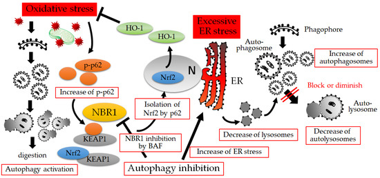 Oxidative stress (OS) and endoplasmic reticulum (ER) stress on autophagy. OS activates autophagy in trophoblasts. The induction of HO-1, an anti-OS enzyme, is dependent on the p62-NBR1-Nrf2 axis, but not the general autophagy pathway. Excessive ER stress inhibits autophagy via the decrease of lysosomes, resulting in the increase of autophagosomes. Bafilomycin (BAF) suppresses NBR1 expression, suggesting that autophagy inhibition by ER stress attenuates the anti-OS response. HO-1: heme oxygenase-1; KEAP1: Kelch-like ECH-associated protein 1; N: nucleus; Nrf2: nuclear factor-erythroid 2-related factor 2; p-p62: phosphorylated p62.