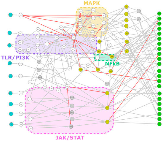 We performed a systematic search of research articles describing the effects of extracellular stimuli on macrophage polarization in terms of changes in gene expression. Receptors (to serve as input nodes) and genes (to serve as output nodes) that have multiple available references with unprocessed raw data documenting their impact on macrophage polarization, showing that they are often used to induce it or as markers of it, respectively, were selected as the frame of the model [22,33,34] (see also the references in Supplementary Table S3). This was carried out both to restrict the size of the model (compared to extracting an extensive list from a database) and to make it feasible to verify the model based on published research data. In addition, in order to incorporate a gene into the model, information describing the transcription factors necessary and sufficient for its expression was necessary. We are not aware of any large-scale database of this information and manually curated all protein–gene interactions. Potential output nodes without sufficient support were excluded [22]. The nodes connecting the two sides of the model are identified using the KEGG Pathway database [35]. We focused on pathways that we expected to be described in the literature in sufficient detail to make the translation of their constituent processes into our Boolean representation possible. We selected the MAPK, TLR, PI3K/AKT and Jak/STAT pathways, as together they contain all the input and output nodes and establish signal transductory linkages between them. As signaling often relies on combinatorial effects, this core list was expanded with first neighbor nodes that create crosstalk amongst these pathways through the edges found in the interaction databases (see Edges). In addition, in some cases we were unable to satisfy the verification criteria with the nodes identified systematically, and hypothesized that an element missing from the model is responsible for the discrepancy. We performed a manual search of the literature to reveal proteins with considerable impact on these processes that were not included or sufficiently connected in the databases (e.g., STK4 has no outgoing edge in KEGG and no link to any other part of our model in STRING). These were included if by doing so the criterion in question could be satisfied.