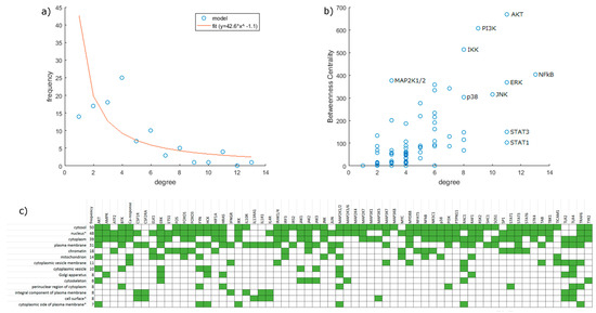 Our network consists of 106 nodes, divided into 9 input, 22 output and 75 inner nodes, and 217 edges connecting them (Figure 1). Supplementary Tables S1 and S2 show nodes and edges, respectively. Intracellular interaction networks are usually expected to be scale-free [40]. Our model being a control network, its degree distribution is somewhat distorted compared to other biological networks. Nodes with no output or input are only those explicitly designated as inputs or outputs, respectively, with few exceptions for technical reasons (JAK-s are constitutively active with no input but affect the network only via receptor complexes). Thus, nodes with a degree of 1 are relatively underrepresented. Compared to expectations, we also obtained an abundance of nodes with a degree of 4. One factor is that technical nodes are overrepresented in this group (8 out of 11 have a degree of 4), but even excluding them, the number remains above the expected value. If we exclude degrees 1 and 4 as outliers, the network is scale-free, i.e., it shows a power law distribution (R2 = 0.80) (Figure 2a).