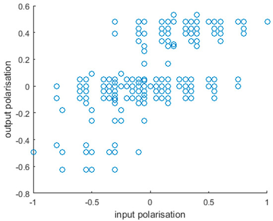 Alignment of input and output polarization. Each point represents an input combination. While input polarization does not translate directly to the output, there is a clear correlation between the two, further supporting that our model is in line with our understanding of the effects of these factors.