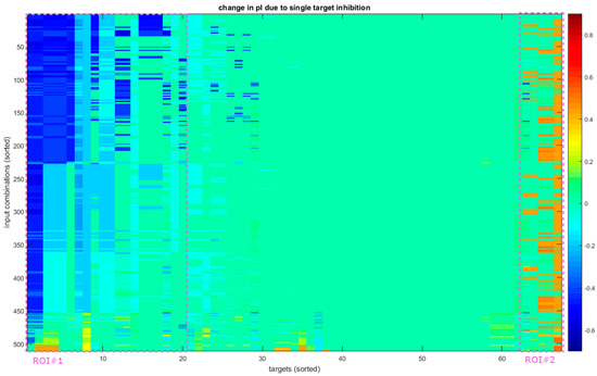 Reactions of the system to single-target inhibition. The vertical axis shows all 511 input combinations and the horizontal all 67 perturbed nodes (direct inhibition of input and output nodes is not performed, extending to receptors with the exception of TLR2 and 4). Both axes are sorted for presentation purposes based on the first principal component of the data. The highlighted areas show the portion of instances that shift predominantly towards a regenerative function (ROI#1) or a more inflammatory one (ROI#2). These only cover approximately 30% and 7% of targets, respectively, and are not homogenous, showing that most inhibitions have a limited effect on the state of the cell.