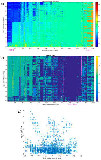 Effects of the simultaneous inhibition of 2 nodes. (a) Changes in the polarization index in response to combined inhibition. Areas that shift predominantly towards one state are highlighted (as ROI#1 and #2), similar to Figure 4. They are slightly larger, with approximately 37% of target combinations mainly causing a shift in a regenerative direction and 11% towards an inflammatory state (compared to 30 and 7% for individual target inhibition, see Figure 4.) (b) Synergy index in all conditions. The ROIs present in previous heatmaps are not clearly visible, except the mostly inert zone (marked) where the inhibition has little to no effect. High synergy spots appear scattered compared to the ΔpI. The axes in (a,b) are sorted for presentation purposes, and the order is the same in both, based on ΔpI. (c) Synergy index is achieved in relation to a shift in the polarization index. Values are somewhat cropped due to the 𝜏 adjustment parameter (see Equation (3) in Materials and Methods) capping synI at ΔpI/𝜏.