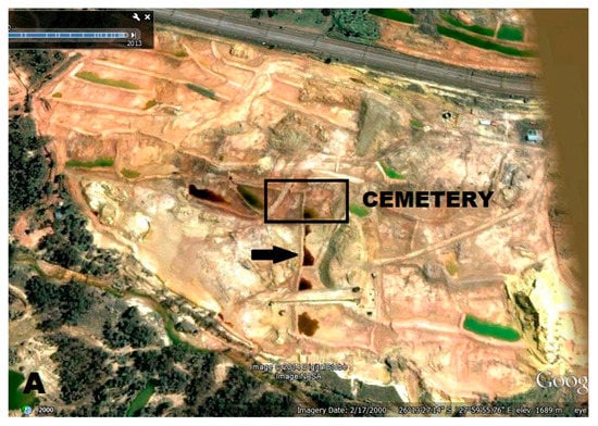 Google Earth images taken in 2000 (A) and 2011 (B) illustrating the footprint of the mine dump in relation to the historic cemetery (black blocks) and the paddock/s highlighted below or on the left of the cemetery (black arrows).