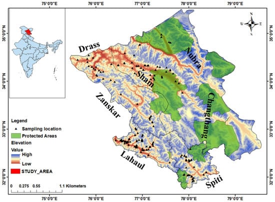 - Raina, R.K.; Koul, M.N. Impact of climatic change on agro-ecological zones of the Suru-Zanskar valley, Ladakh (Jammu and Kashmir), India. J. Ecol. 2011, 3, 424–440. [Google Scholar]