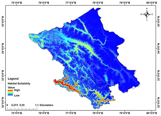 Habitat suitability map with higher suitability (red) and lowest suitability (dark blue) shows maximum suitability in Lahaul-Spiti region.