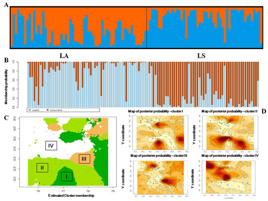 We obtained two possible clusters in STRUCTURE (Figure S3) based on delta K plot. The majority of the samples, i.e., 56.75% collected from LA and LS were accordingly assigned into two clusters, while two individuals from LS were assigned with LA and eight individuals sampled from LA were genetically assigned with the LS population (Figure 4A). We obtained 48 admixed individuals, not assigned to any of these clusters, indicating a bidirectional gene flow between LA and LS. DAPC also resulted in a similar output and showed intermixing between two clusters (Figure 4B and Figure S4). We interpret gene–land results with the correlated allele model, which showed four meta-populations where most of the individuals were assigned into two major clusters, i.e., Cluster II and IV (Figure 4C,D).