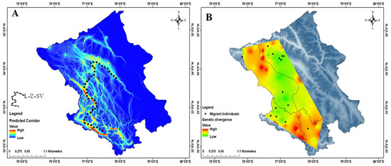 (A) Predictive corridor map for movement of ibex in the study area “L-Z-SV corridor”. (B) Genetic divergence plotted across the landscape shows low divergence in the central region (L–Z–SV corridor) and the locations of migrants plotted on the map showing movement in the corridor landscape.