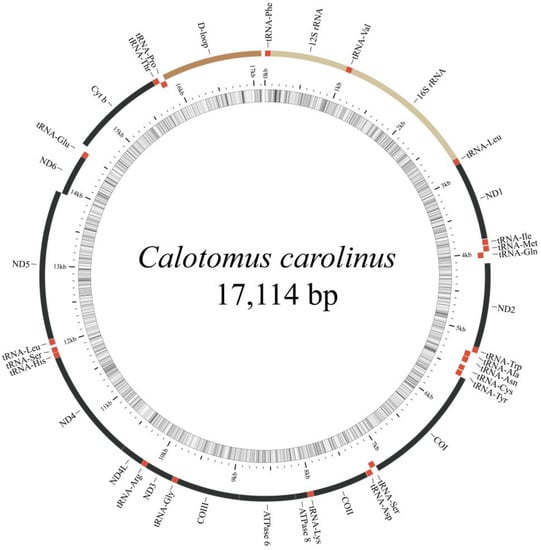 The mitochondrial genome (mitogenome) of a vertebrate is a small (16–17 kb), compact, and circular double-stranded molecule, typically encoding 13 protein-coding genes (PCGs), 22 transfer RNA genes (tRNAs), two ribosomal RNA genes (rRNAs), and two non-coding regions (the origin of L-strand replication, OL, and control region, CR) []. The mitochondrial DNA sequences have been extensively employed in a variety of study areas, from phylogeography, which elucidates the spatial arrangement of genetic variation among populations or closely related species [,,], to phylogenetic studies, which decipher the evolutionary relationships across a wide range of taxa at higher taxonomic levels [,,]. Compared to single or a few mitochondrial gene-based markers, the complete mitogenome sequences generally provide much finer phylogenetic resolution []. Moreover, genome-level characteristics, including nucleotide composition, genome structural arrangement, overlap, and non-coding intergenic spacers between genes, vary largely among different species and might possess evolutionary significance [,,].