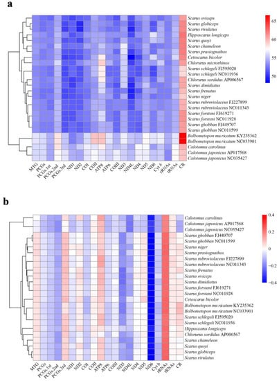 - Nie, R.-E.; Breeschoten, T.; Timmermans, M.J.T.N.; Nadein, K.; Xue, H.-J.; Bai, M.; Huang, Y.; Yang, X.-K.; Vogler, A.P. The phylogeny of Galerucinae (Coleoptera: Chrysomelidae) and the performance of mitochondrial genomes in phylogenetic inference compared to nuclear rRNA genes. Cladistics 2018, 34, 113–130. [Google Scholar] [CrossRef]
