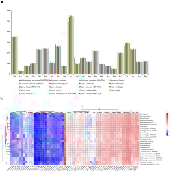 (a) Amino acid frequency in the parrotfish mitogenomes. (b) Heatmap based on the relative synonymous codon usage (RSCU) in the parrotfish mitogenomes.