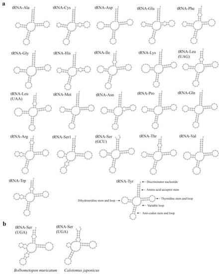 (a) Putative secondary structure of tRNAs in parrotfish mitogenomes. (b) Putative secondary structure of tRNASer(AGN) in Bolbometopon muricatum and Calotomus japonicus.