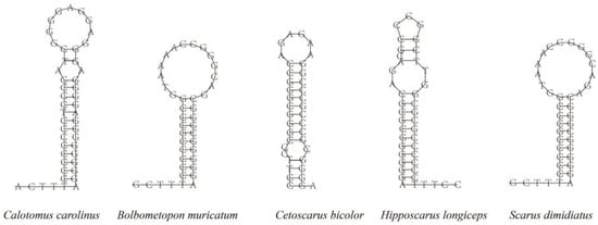 The comparative analysis revealed that the mitogenome structure, organization, codon usage, and putative secondary structures of tRNAs were highly similar among all the analyzed parrotfish species. The gene rearrangement of the tRNA gene cluster between ND1 and ND2 was detected, which is typical of parrotfish [,,]. In parrotfish mitogenomes, the tRNAMet was located between the tRNAIle and tRNAGln, then a putative tRNAMet pseudogene was located after the tRNAGln. The gene rearrangements had been proposed to occur with tandem duplication of gene regions as a consequence of slipped-strand mispairing, followed by deletions of redundant genes []. The tRNAMet pseudogene was believed to function as punctuation marks for mitochondrial ND2 mRNA processing [].