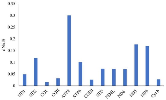 To better understand the role of selective pressure and the evolutionary patterns of the protein coding genes, the dN/dS value (ω) of each PCG was calculated (Figure 7). All of the PCGs were subject to purifying selection, with a dN/dS value lower than 1 (ω < 1). Among which, ATP8 and COI presented the highest and lowest ω values (ω = 0.300 and 0.016), respectively.