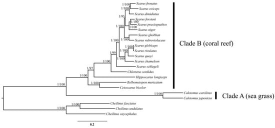 Prior to the phylogenetic analysis, the method of Xia et al. [] was used to access substitution saturation of the sequences by comparing the information entropy-based index (ISS) with critical values (ISS.c) in DAMBE 7 []. If ISS is significantly lower than ISS.c, then sequences have not experienced substitution saturation. The sequence of the control region showed significant substitution saturation (ISS = 1.1897 > ISS.c = 0.7851, p < 0.001) and was thus excluded from further analysis. The phylogenetic relationships were reconstructed using the 13 PCGs and 2 rRNAs of the 19 parrotfish mitogenomes. Three Cheilinus species (C. fasciatus, NC037707; C. oxycephalus, NC061045; C. undulatus, NC013842) were used as outgroup taxa. Multiple sequence alignment was performed using MAFFT [] implemented in PhyloSuite [] under default parameters and subsequently checked by eye in SeaView []. Our dataset was partitioned by gene and codon position, and then the best-fit nucleotide substitution model for each partition was determined using Modelfinder []. Phylogenetic relationships were reconstructed using Bayesian inference (BI) and maximum likelihood (ML) approaches. BI was carried out in Mr. Bayes 3.2.7 []. Two independent Markov chains were run with 1 × 106 iterations, and 10,000 trees were retained, with the first 25% of the samples discarded as burn-in. ML analysis was conducted in IQTREE [] under 10,000 ultrafast bootstrap replicates. DNAsp 6 [] was used to calculate non-synonymous substitution rates (dN), synonymous substitution rates (dS), and the ratio of dN/dS (ω).