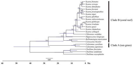 Two fossil calibration points were used in the divergence time estimation. Calotomus preisli was known from the middle Miocene (~14 Ma) in Austria []. We calibrated the minimum age of the split between the sea grass clade and the coral reef clade using this fossil. The fossil elements belonging to the genus Bolbometopon were known from the late Miocene (~5.3 Ma) []. These fossils were used to set the minimum age of the separation between Bolbometopon and Cetoscarus. The root age of our phylogeny was set to be lower than 50 Ma, for the oldest known labrid fossil was dated back to 50 Ma from the Monte Bolca in Italy [].
