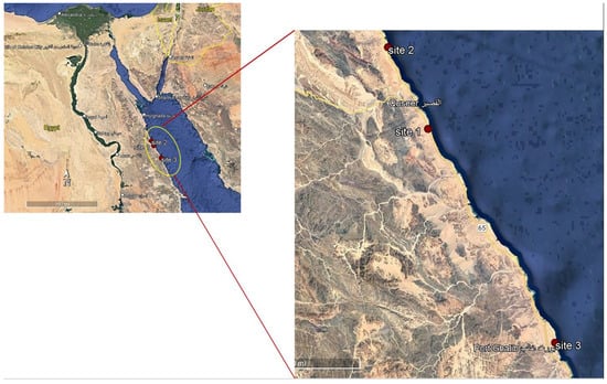 Map illustrating the three collection sites along the Red Sea, Egypt.