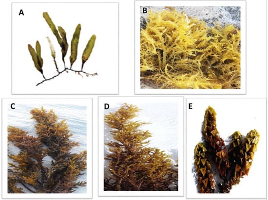 - Lorenzo, J.M.; Agregán, R.; Munekata, P.E.; Franco, D.; Carballo, J.; Şahin, S.; Lacomba, R.; Barba, F.J. Proximate composition and nutritional value of three macroalgae: Ascophyllum nodosum, Fucus vesiculosus and Bifurcaria bifurcata. Mar. Drugs 2017, 15, 360. [Google Scholar] [CrossRef] [PubMed]