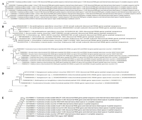 Phylogenetic tree of 18s rRNA sequences of macroalgae. (A) Caulerpa prolifera, (B) A. spicifera, (C) Cystoseira myrica, (D) Cystoseira trinodis and (E) T. ornata. constructed by NCBI/BLAST.