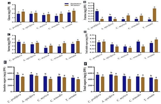 Seasonal variations in the concentrations (mg/g DW) of (A) Glucose, (B) Fructose, (C) Sucrose, (D) Soluble sugars, (E) Insoluble sugars and (F) Total sugars in macroalgae Caulerpa prolifera, A. spicifera, Cystoseira myrica, Cystoseira trinodis, and T. ornata. Values are shown as means ± S.E. (n = 3). Different letters show significance between the two seasons of the same species (p < 0.05).
