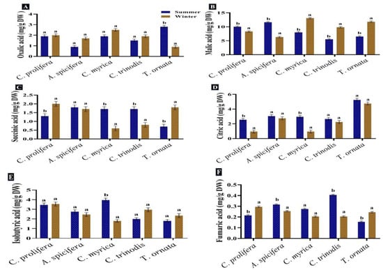Seasonal variations in the concentrations (mg/g DW) of (A) Oxalic acid, (B) Malic acid, (C) Succinic acid, (D) Citric acid, (E) Isobutyric acid and (F) Fumaric acid in macroalgae Caulerpa prolifera, A. spicifera, Cystoseira myrica, Cystoseira trinodis and T. ornata. Values are shown as means ± S.E. (n = 3). Different letters show significance between the two seasons of the same species (p < 0.05).