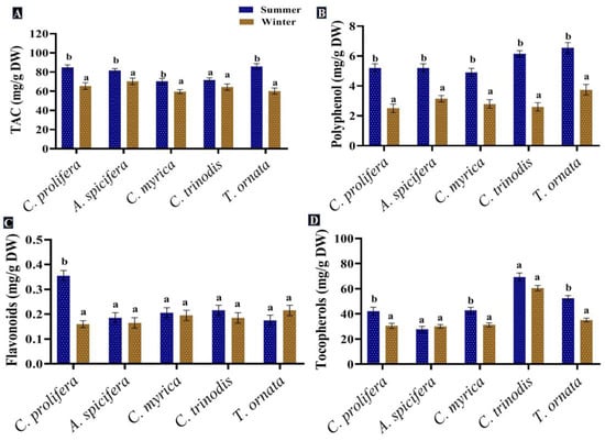 Seasonal variations in the concentrations (mg/g DW) of (A) TAC, (B) Polyphenol, (C) Flavonoids and (D) Tocopherols in macroalgae Caulerpa prolifera, A. spicifera, Cystoseira myrica, Cystoseira trinodis and T. ornata. Values are shown as means ± S.E. (n = 3). Different letters show significance between the two seasons of the same species (p < 0.05).