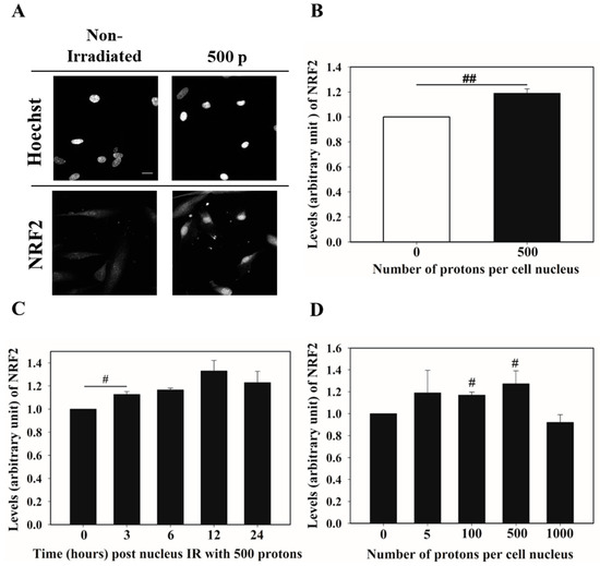 A total of 500 protons were irradiated at the nucleus of WI-38 cells. Twenty-four hours later, immunofluorescence staining revealed the increase in NRF2 in the nuclei. Scale bar = 30 µm (A,B). The nucleus of the WI-38 cells was targeted by 500 protons and then incubated. Immunofluorescence staining was used to identify the levels of NRF2 in the nuclei at various time points after irradiation (C). The nucleus of the WI-38 cells was targeted by different amounts of protons. Twelve hours later, the nucleus accumulation of NRF2 was detected by immunofluorescence staining (D). # p value < 0.05. ## p value < 0.01.